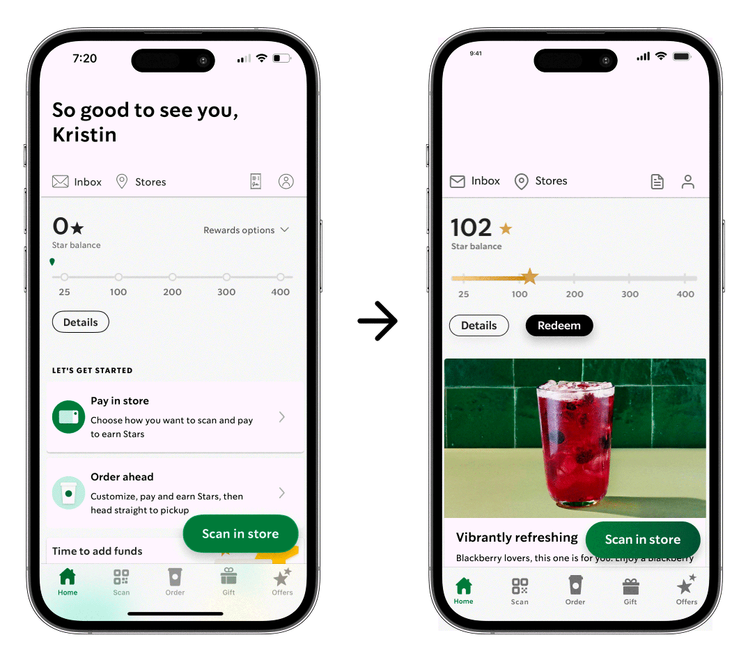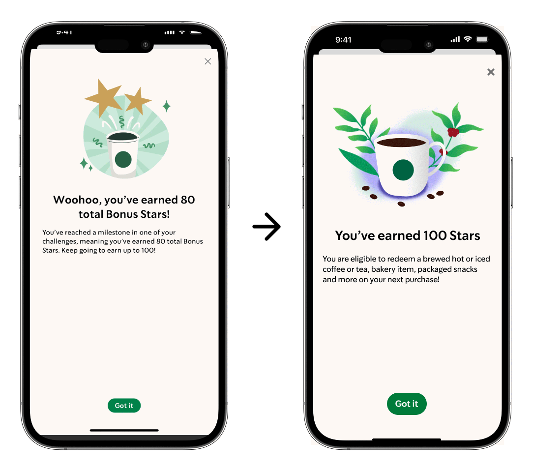 The 100-Star reward animation was designed to spotlight the experience of earning and enjoying a handcrafted beverage. By framing the scene with coffee plants and beans, the design ties the reward back to the company’s roots in high-quality coffee and intentional craftsmanship.