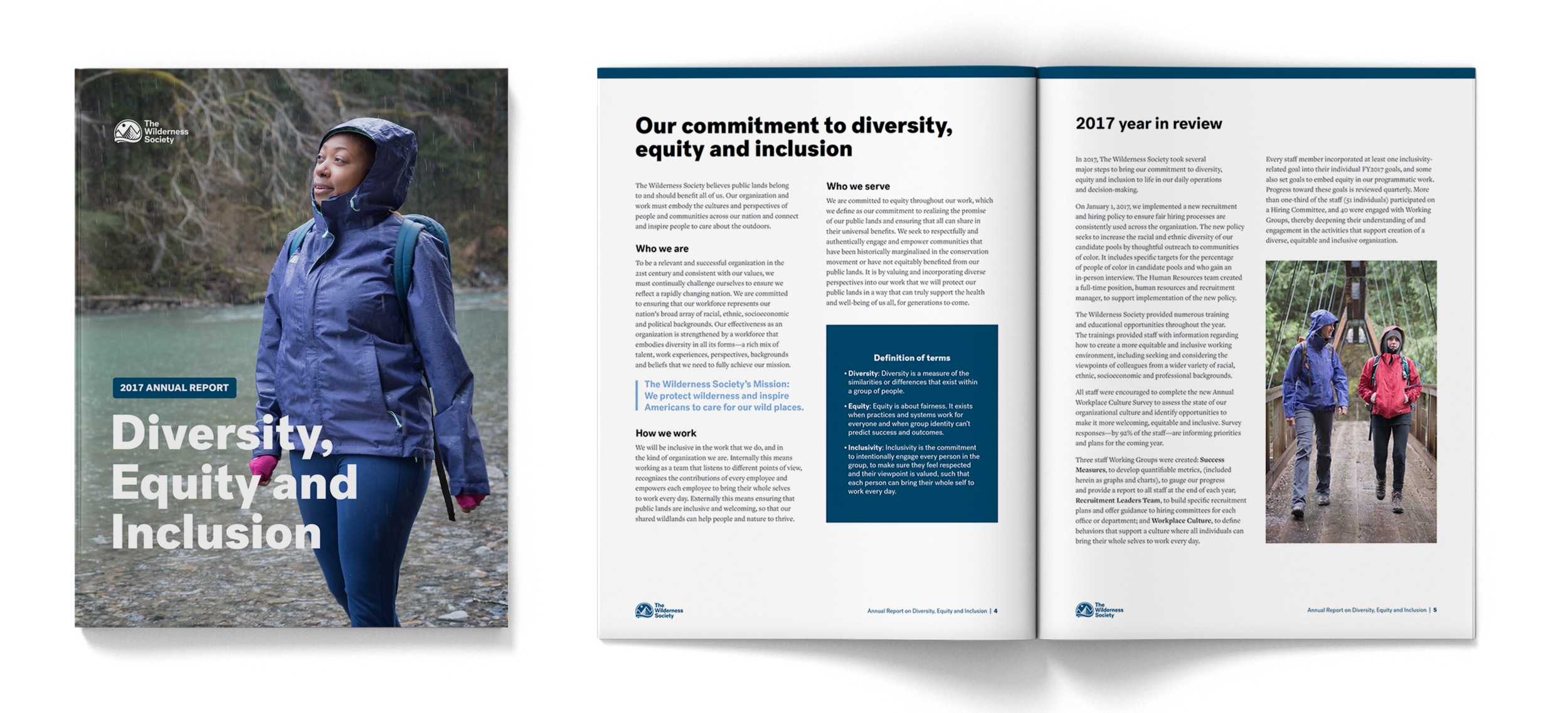 At Apptio, the Wilderness Society, and various freelance opportunities I created print collateral. This included pivotal pieces such as Apptio’s Go-to-Market Playbook which guided thousands of sales personnel through their process and the Wilderness Society’s first-ever Diversity, Equity, and Inclusion (DEI) Report. The DEI Report summarized how the company had achieved its DEI goals over the past year. In addition to these pieces, I also created a variety of ebooks, printed pieces, and infographics. One particularly enjoyable project was creating the print templates for Apptio’s brand refresh.
